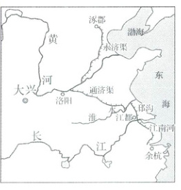 材料二:605 年,(隋炀帝)发河南、淮北诸郡民,前后百余万人,开掘名为通济渠的大运河。自洛阳西苑引谷、洛二水入黄河,自黄河入汴水……引汴水以达准水。