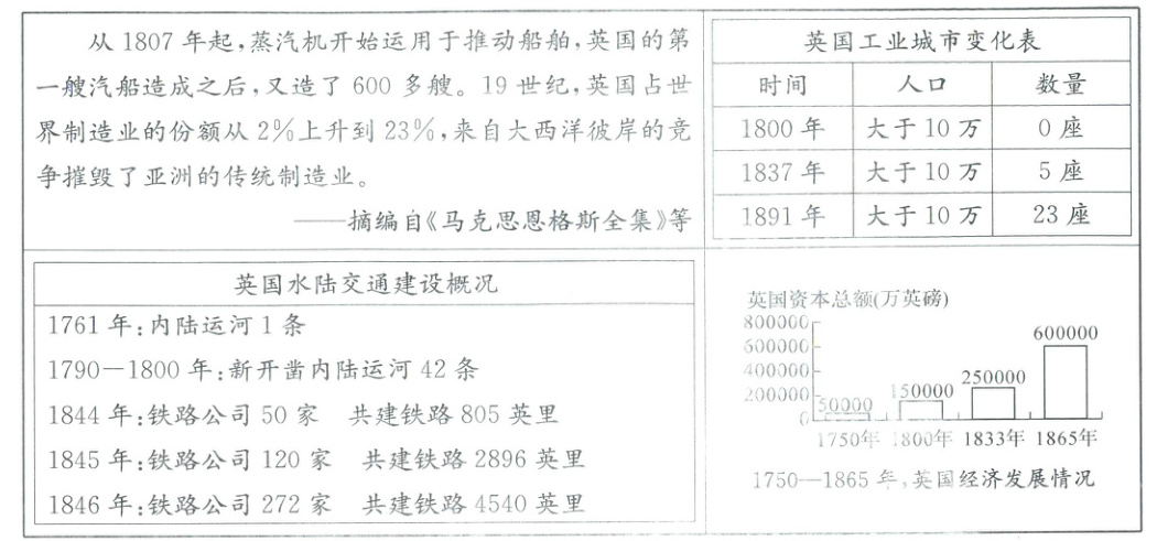 (2)经济发展是一种合力的结果。指出上图中至少三个与英国经济发展相关的因素,并探究它们之间的关系。(5 分)