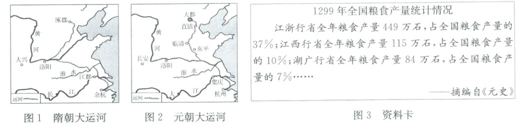 (2)“图”说运河。比较两幅运河地图,说说元朝的京杭大运河发生了怎样的变化? 联系资料卡及所学知识分析变化的原因。(4 分)