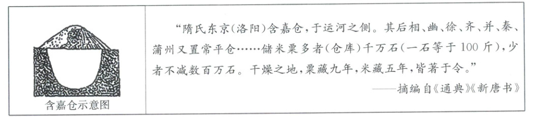 (1)隋朝粮仓数量多;规模大(或储量大);储存条件好;存放时间久等。(两点即可,2分)