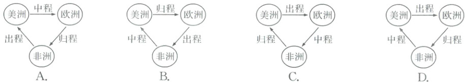 15. “三角贸易”反映了资本原始积累的野蛮性和残酷性。下图中能反映“三角贸易”航程路线的是(