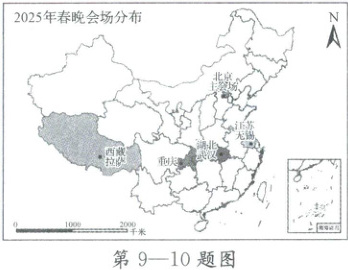 2025 年央视春晚于北京时间 1 月 28 日 20:00 开场并同时向全球现场直播。除了北京的主会场外,还有四个分会场。右图是央视春晚会场分布。据此完成 9—10 题。