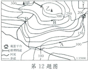 12. 右图为浙江某旅游景区等高线地形图。下列说法正确的是(