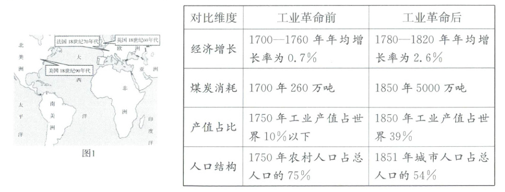 材料一:工业革命开始时间图及工业革命前后对比表。