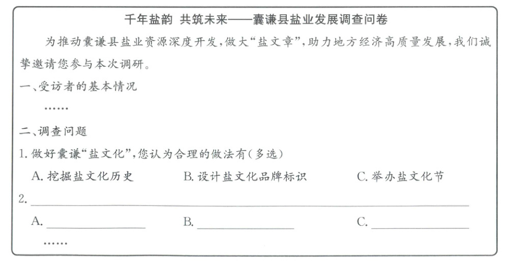 (3) 为囊谦县盐业发展设计调查问卷,请你参照调查问题 1,拟写调查问题 2。(3 分)