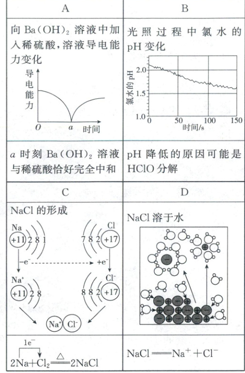 9.C溶液导电能力、光照氯水分解、氯化钠的形成、氯化钠溶于水等图示 Ba(OH)₂ + H₂SO₄ = BaSO₄↓ + 2H₂O,随着稀H₂SO₄的加入,生成BaSO₄和H₂O,溶液的导电能力降低,a点Ba(OH)₂和H₂SO₄恰好完全中和,导电能力几乎为0,继续加入稀H₂SO₄,溶液中离子浓度增大,导电能力增大,A正确;光照过程中氯水中的次氯酸分解生成盐酸和氧气,溶液酸性增强,pH减小,B正确;由图可知,氯化钠的形成过程为Na失去一个电子形成Na⁺,Cl得到一个电子形成Cl⁻,Na⁺与Cl⁻通过离子键形成NaCl,形成过程表示为Na× + ·Cl: → Na⁺[:Cl:]⁻,且用单线桥表示应为2Na + Cl₂ = 2NaCl,C错误;NaCl是可溶性盐,在水中完全电离,电离方程式为NaCl = Na⁺ + Cl⁻,D正确。