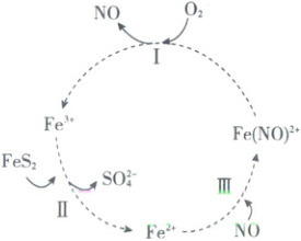 15.B黄铁矿催化氧化反应 由图可知反应Ⅰ过程中:Fe(NO)²⁺中铁元素化合价升高,氧气中氧元素化合价降低,反应的离子方程式为4Fe(NO)²⁺ + O₂ + 4H⁺ = 4Fe³⁺ + 4NO + 2H₂O,A正确;反应Ⅱ中Fe元素由 + 3价变成 + 2价,反应Ⅱ中Fe³⁺是氧化剂,B错误;反应Ⅲ中无元素化合价变化,所以反应Ⅲ是非氧化还原反应,离子方程式为Fe²⁺ + NO = Fe(NO)²⁺,C正确;NO与Fe²⁺反应生成Fe(NO)²⁺,Fe(NO)²⁺被O₂氧化为Fe³⁺,同时又生成NO,则黄铁矿催化氧化中NO作催化剂,D正确。
