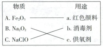 【解析】氧化铁为红棕色固体,可用作红色颜料;过氧化钠能与二氧化碳或水反应产生氧气,可用作供氧剂;次氯酸钠具有强氧化性,可用作消毒剂。