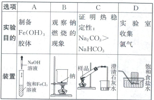 15.D 实验方案的设计与评价 向沸水中滴入饱和FeCl₃溶液,继续加热至液体变为红褐色,停止加热,得到Fe(OH)₃胶体,A错误;钠应放在坩埚中加热,B错误;加热固体时,试管口需略向下倾斜,C错误;Cl₂难溶于饱和食盐水,可以用排饱和食盐水的方法收集Cl₂,D正确。