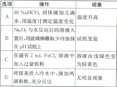 16.B 实验方案的设计与评价 NaHCO₃溶于水吸热,温度计示数降低,A错误;2Na₂O₂ + 2H₂O = 4NaOH + O₂↑,反应后久置,溶液显碱性,使pH试纸变蓝,B正确;Fe + 2FeCl₃ = 3FeCl₂,溶液由棕黄色变为浅绿色,C错误;镁条在冷水中反应很缓慢,会有少量气泡产生,D错误。