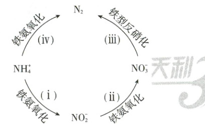13.BC 一种新型脱氮流程分析 铁氨氧化中,N 元素化合价升高,故$Fe^{3+}$转化为$Fe^{2+}$,A错误;将$NH_4^+$转化为$N_2$,两个途径不同,但氮元素的始末价态相同,最终失去的电子数相同,B正确;反应ⅲ中$NO_3^-→N_2$,其反应的离子方程式为$2NO_3^-+10Fe^{2+}+12H^+=N_2↑+10Fe^{3+}+6H_2O$,C正确;四步反应中,步骤ⅲ中$NO_3^-→N_2$,氮元素被还原,D错误。