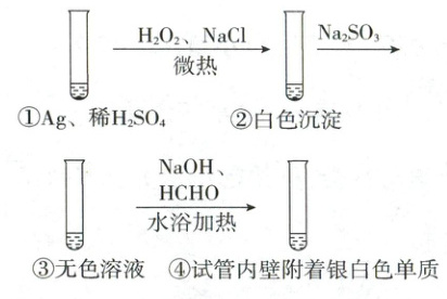 $①→②$发生反应$2Ag+H_2O_2+2Cl^-+2H^+=2AgCl+2H_2O$,A 正确;$Ag^+$能催化$H_2O_2$分解,$H_2O_2$受热也易分解,$H_2O_2$实际消耗比理论用量多,B 正确;$③→④$为碱性环境,其反应的离子方程式为$4[Ag(SO_3)_2]^{3-}+HCHO+6OH^-=4Ag↓+CO_3^{2-}+8SO_3^{2-}+4H_2O$,C错误;反应$②→③$中无元素化合价变化,为非氧化还原反应,D错误。