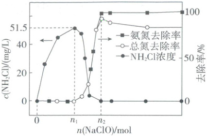 15.B 氨氮废水的绿色处理 当$n(NaClO)=n_1$时氨氮去除率和总氮去除率均为0,说明只发生反应①,由反应①的离子方程式$NH_3+ClO^-=NH_2Cl+OH^-$可知,反应①为非氧化还原反应,无电子转移,A 错误;根据$n_1$时$c(NH_2Cl)=51.5mg/L$可知,$n_1$时$n(NH_3)=n(NH_2Cl)=\frac{51.5×10^{-3}g/L×1L}{51.5g/mol}=0.001mol$,当$n(NaClO)=0.0012mol$时,同时发生反应①和②,设反应①中消耗$NH_3xmol$,反应②中消耗$NH_3ymol$,可列方程$x+y=0.001$、$x+1.5y=0.0012$,解得$x=0.0006$、$y=0.0004$,故反应①生成$NH_2Cl$的物质的量为$0.0006mol$,其浓度为$c(NH_2Cl)=\frac{0.0006mol×51.5g/mol×1000mg/g}{1L}=30.9mg/L$,B正确;$n_2$时,氨氮去除率为100%,总氮去除率低于100%,$c(NH_2Cl)=0mg/L$,说明部分氨发生反应③,又$2NH_2Cl+ClO^-+2OH^-=N_2↑+3Cl^-+3H_2O$,则$n_2>0.0015mol$,C错误;当$n(NaClO)>n_2$时,发生反应②和③,无具体数据,无法计算,D错误。