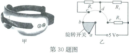 30. 某电热敷眼罩如图甲所示,有高温、中温和低温三个挡位,图乙是内部简化电路图,$R_{1}$、$R_{2}$、$R_{3}$为加热电阻,其中$R_{1}$、$R_{2}$的阻值均为10 Ω,通过旋转开关可以实现挡位切换,正常工作时电压为5 V。