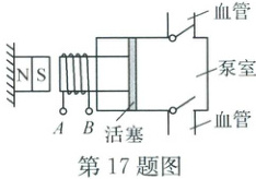 17. 人工心脏泵可短时间替代心脏泵血,其基本结构如图。当电流从$A$端流入时,电磁铁左端为
