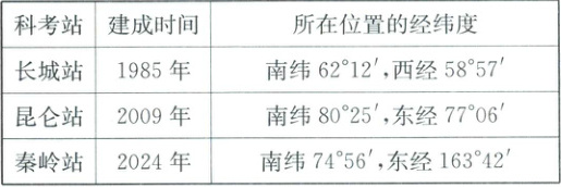 。(2)目前我国已在南极洲建立了五个科考站,如表为其中三个科考站建站时间及所在地的经纬度,其中最接近南极点的是