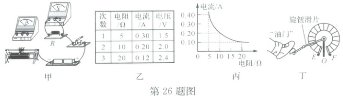 。【实践应用】如图丁是电动汽车“油门”示意图。若踩下“油门”时,滑片逆时针转动,汽车加速,则应将$E$、$O$、$F$中哪两个接线柱接入电路中。