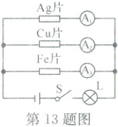 13. 某学习小组为了探究不同金属导电性强弱,进行了如图所示的实验。在金属片横截面积、长度相同的情况下,电流表 A₁、A₂、A₃ 测得的电流分别为 I₁、I₂、I₃,且 I₁ > I₂ > I₃。则下列说法错误的是(