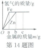 14. 两烧杯中盛有等质量、等质量分数的稀盐酸,现向两烧杯中分别加入质量都为 m 的金属 Zn 和 Fe,生成氢气的质量随加入金属质量的关系如图,由图可知(