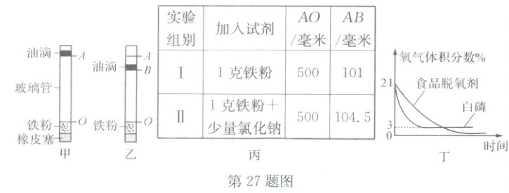 27. 食品脱氧剂的主要成分是铁粉,另有少量氯化钠等物质,其原理是利用铁生锈的原理除去氧气。有人认为氯化钠可以增强铁粉的除氧能力,即能将容器中的氧气浓度降到更低。为验证该说法是否正确,小敏利用一端塞有橡皮塞的玻璃管进行了如下实验:
