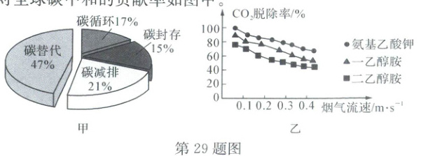 29. 科学家预测:到 2050 年,碳替代、碳减排、碳封存、碳循环 4 种途径对全球碳中和的贡献率如图甲。