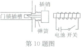 10. 如图所示是一种磁性门锁的工作原理示意图:闭合开关,电磁铁吸引插销,门打开;断开开关,在弹簧的作用下,插销重新插入门锁插槽,门锁上。下列有关磁性门锁的说法错误的是(