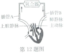 12. “人工肺”可给重症心肺功能衰竭患者提供持续的体外呼吸与循环,以维持患者生命。如图所示,该设备将人体内上腔、下腔静脉中的血液引出体外,经氧合器进行处理后,送回患者肺静脉。血液在氧合器发生的主要变化是(