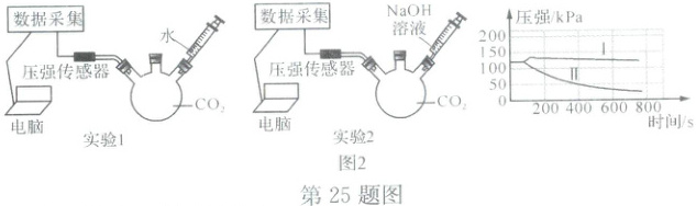 (2)小组同学用如图 2 装置研究二氧化碳与氢氧化钠的反应,用注射器分别注入等体积的水和氢氧化钠溶液,测得压强随时间变化的图象如图曲线Ⅰ和Ⅱ所示。