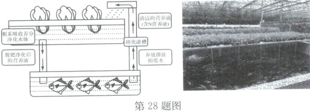 28. “鱼—菜共生”是一种新型生态农业模式,其运行原理为:①鱼类排泄物和残饵被硝化滤槽内的微生物(硝化细菌)分解为含氮、磷等无机盐;②蔬菜根系吸收水中养分,净化水体;③净化后的水循环回鱼池重复利用。该系统实现了“养鱼不换水,种菜不施肥”的可持续循环,模式图如下。