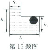 15. 重 5 千克的 L 形容器放在桌面上,底部面积 S₁ = 500 厘米²,上端开口面积 S₂ = 200 厘米²,容器下部分高度为 h₁ = 20 厘米。倒入 12 千克水,放入重 1.6 牛的实心塑料小球。小球静止时如图,此时容器上壁给小球 0.4 牛的作用力,容器内水的总高度为 h₂。以下说法正确的是(