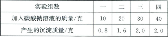 31. 某实验小组为测定食盐样品(含氯化钙杂质)中氯化钠的质量分数,进行如下实验:将 80 克食盐样品平均分成 4 份,分别加入 4 个烧杯中,各加入 80 克水溶解后,向每组中加入不同质量的相同浓度的碳酸钠溶液,充分反应后过滤、洗涤、干燥,称量生成的沉淀质量。实验数据如下表所示: