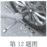 12. 用如图所示的扳手拧螺丝时,一只手稳住扳手的十字交叉部位,另一只手分别握在扳手上$A$、$B$、$C$三个位置拧动螺丝,最省力的位置是 (