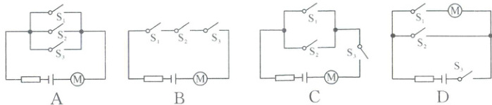 15. 某电动汽车的车门有三种识别解锁方式:①手机蓝牙(开关${S_{1}}$);②${NFC}$钥匙卡(开关${S_{2}}$);③传统遥控钥匙(开关${S_{3}}$)。任意一种方式识别成功,相应开关闭合,电动机${M}$通电启动,车门解锁。为实现上述功能,下列电路设计图符合要求的是 (