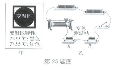 25. 小科在验证“电阻丝产生的热量与电阻、电流及通电时间的关系”时,采用了一种“变色测温贴”(产品介绍如图甲所示),常温下将测温贴贴在电阻上,并连接如图乙所示的实验电路,闭合开关,记录测温贴变色所用的时间。断开开关,待测温贴$?$,调节滑动变阻器,闭合开关,继续测量测温贴变色所用时间,所得结果如下表: