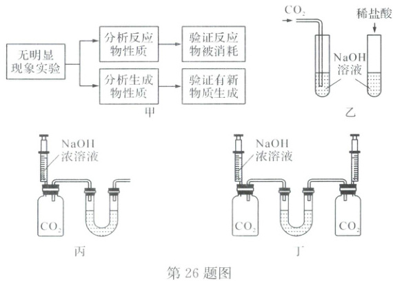 26. 小科在学习“碱的化学性质”时,将二氧化碳通入氢氧化钠溶液中,没有明显现象产生,因而无法判断两者是否发生了化学反应。小科分析后总结了“无明显现象实验可视化”的思维模型(如图甲),并进行了如下实验。