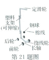 21. 学习能量守恒转化后,项目化学习小组利用钢球、棉线、塑料支架、定滑轮等器材制作了一辆重力小车,如图所示。使用时转动车轮,不断将棉线绕在长轴的绕线轮上,直至钢球上升到支架的最高点。然后松手,让钢球下落带动长轴转动从而驱动重力小车行驶。