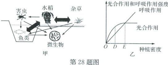 28. “稻鱼共生”是一种让鱼、水稻、微生物三者之间形成生态平衡的复合耕种模式,如图甲所示。