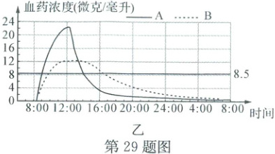 (4) 为研究如何科学用药,A 组服用布洛芬片剂,B 组服用相同剂量的布洛芬缓释胶囊,测得平均血药浓度如图乙。小明在运动中拉伤导致肌肉疼痛,医生建议他服用布洛芬缓释胶囊,试推测医生建议的理由: