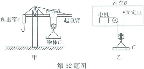 32. 如图甲是建筑工地上的“塔吊”示意图,其配重箱 A 重 4000 kg,起重臂上有一个可以沿水平方向左右移动的滑车 B,图乙为滑车 B 及滑轮组中钢绳的穿绳示意图,滑车 B 内装的电机可卷动钢绳提升重物。现用该装置吊起重 $ 8×10^3 $ N 的物体 C,不计起重臂、滑车 B、钢绳、动滑轮重及摩擦。