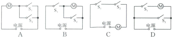 5. 校园安全至关重要,因此各校在人口处安装了门禁系统,如图所示。现要设计一款门禁系统,要求师生刷卡(相当于闭合S₁)或者人脸识别成功时(相当于闭合S₂),电动机启动,闸门打开放行。如图所示电路设计中符合上述要求的是(