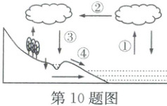 10. 海绵城市,是指通过一些设施,使城市能够像海绵一样,吸收和储存雨水,并在需要的时候将其释放和利用。结合水循环模式图,强降雨后,海绵城市可以减弱的环节是(