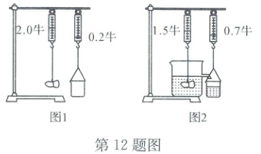 12. 某同学用如图所示实验装置验证阿基米德原理。将物块和空桶挂在弹簧测力计上,读数如图1所示;将物块浸没在装满水的溢水杯中,稳定后,弹簧测力计的读数如图2所示。此时物块受到的浮力大小是(
