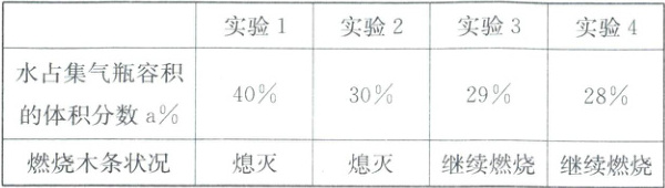 (4)查阅资料获知,木条能否继续燃烧是由容器内氧气的体积分数决定的。该同学在集气瓶中装入一定体积的水,如图3所示,然后用纯净的二氧化碳气体替换了瓶中的水,再用燃烧的木条检验,结果如表所示。则集气瓶中氧气体积分数小于时,燃着的木条就会熄灭。(空气中氧气体积分数取20%)