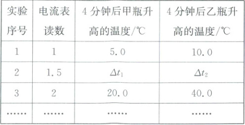 (4)该同学将玻璃管换成温度计,重新实验,测得数据如表所示,得出“在通电时间不变时,电流通过导体产生的热量跟电流的二次方成正比,跟导体的电阻成正比”的结论,则表中Δt₂的值为。