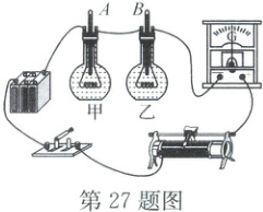 27. 某同学用如图所示装置探究电流通过导体产生的热量与导体电阻、电流大小的关系。甲、乙两个完全相同的烧瓶内装有等量的煤油,瓶内电阻的阻值分别为5欧和10欧,A、B是相同的玻璃管,管内初始液面位置相同。
