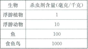 (3)①食鱼鸟摄入杀虫剂的食物链为:浮游植物→浮游动物→鱼→食鱼鸟;②由表格数据可知,杀虫剂的浓度随食物链逐级递增;③最终食鱼鸟体内杀虫剂的浓度超过950毫克/千克,所以食鱼鸟死亡(3分)