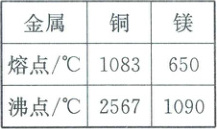 (1)熔炼铜镁合金时,需将铜和镁按一定比例混合并加热,使其完全熔化并形成均匀的合金。已知铜和镁的熔点、沸点如表所示,则熔炼铜镁合金的温度至少要达到