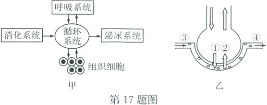 17. (4 分)如图甲所示为人体部分系统关系示意图,如图乙所示为人体呼吸以及肺泡与血液的气体交换过程示意图。回答问题: