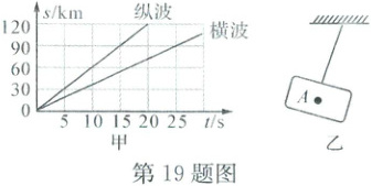 19. 地震时,震源的振动同时以横波和纵波两种形式向外传播,两种波在地壳中的传播速度并不一样;纵波到达时,人会感到上下颠簸,横波到达时,人会感到左右摇摆。台湾省花莲县发生地震时,某监测站测得两种地震波传播时距离(s)与时间(t)的关系图象如图甲所示,回答问题: