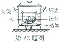 22. 如图所示,利用大煲内的炖盅炖汤。大煲内的水沸腾时,煲盖会不断地跳动,周围有大量“白气”产生。“白气”形成涉及的物态变化有